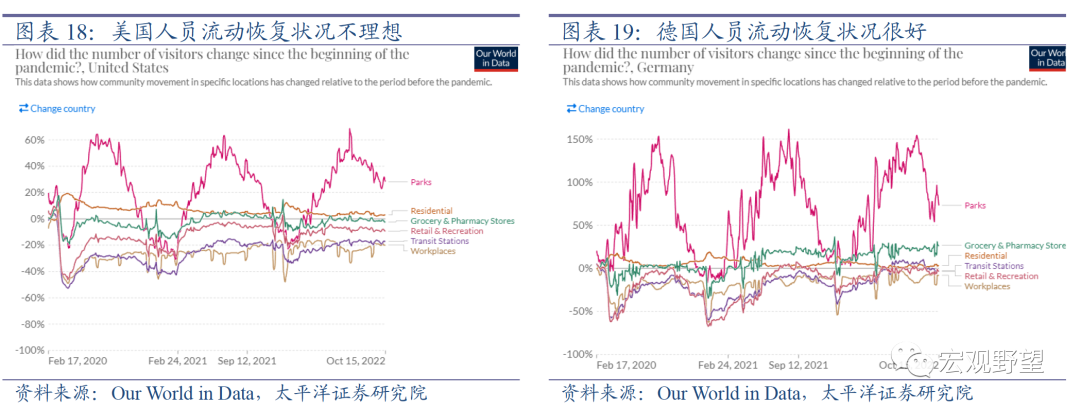 其次我们比较日韩的经验,这两个国家之间也存在较大差异。日本人员流动状况恢复的并不理想,但是韩国人员流动状况恢复的较好,已经基本回到疫情之前的水平。我们认为二者之间的差异可能是疫情防控政策严格程度的不同导致的。以牛津大学编制的新冠疫情防控严格指数来衡量,日本是此前除中国外主要国家之中防疫最为严格的,因而整体人员流动恢复的状况也相对较差。而相比之下,韩国疫情防控政策则非常宽松,各场所的人员流动恢复的状况也非常好。日韩的差异反映出日本人员流动恢复较差可能也并非疫情的长期影响,而是疫情防控政策的影响。