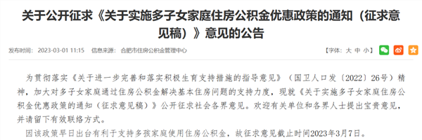 3月1日,合肥住房公积金管理中心发布《关于实施多子女家庭住房公积金优惠政策的通知(征求意见稿)》。