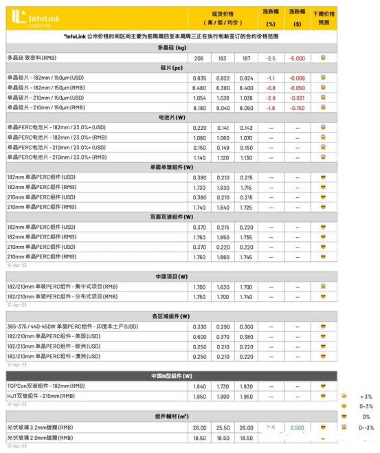 在N型电池片部分,本周价格随着PERC电池片价格维持没有变化,TOPCon(M10)电池片当前成交价格落在每瓦1.2-1.22元人民币。而HJT(G12)电池片由于主要订单来自海外,成交数尚少,落在每瓦1.3-1.4元人民币不等。近期可以观察到TOPCon电池片买卖双方不论厂家数量与成交量都在提升,预计五月出台TOPCon电池片公示价格。