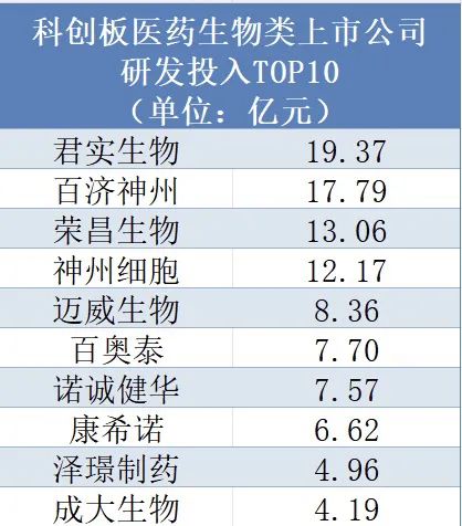 从目前科创板医药生物类上市公司的研发投入情况来看,截至4月23日,共有54家药企披露2023年年报。其中,君实生物、百济神州、荣昌生物、神州细胞全年研发投入超10亿元;另有迈威生物、百奥泰、诺诚健华等33家企业2023年研发投入破亿元。