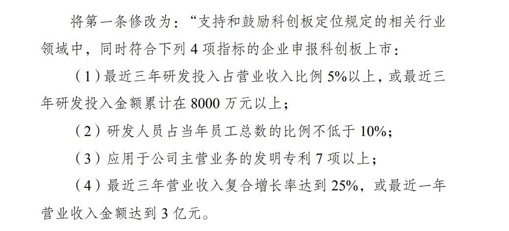对比2020年发布的版本,此次版本主要是对第一条中申报上市的指标要求进行了调整。如“最近三年研发投入金额累计在 6000 万元以上”改为“最近三年研发投入金额累计在 8000 万元以上”;“形成主营业务收入的发明专利 5 项以上”改为“应用于公司主营业务的发明专利7项以上”;“ 最近三年营业收入复合增长率达到 20%”改为“最近三年营业收入复合增长率达到 25%”;新设1项指标,研发人员占当年员工总数的比例不低于 10%。