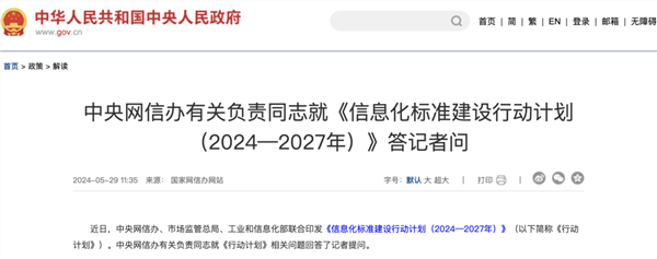 中央网信办有关负责同志就《信息化标准建设行动计划(2024—2027年)》答记者问