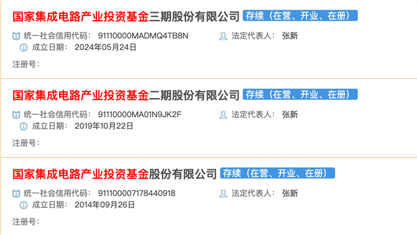 国家集成电路产业投资基金此前已成立过两期,分别成立于2014年9月26日和2019年10月22日,注册资本分别为987.2亿元和2041.5亿元。