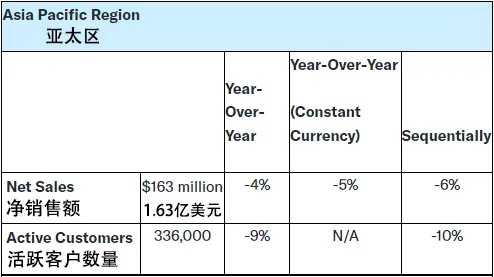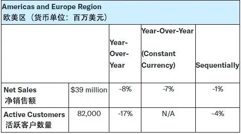 美洲和欧洲区合计贡献销售额3900万美元,同比跌幅8%,环比跌幅1%;82000人的活跃客户数量,同比下降了17%,环比下降4%。