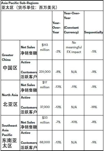 其中,中国区业绩1.13亿美元,同比下滑2%,环比下滑5%;活跃客户数量231000人,同比下降8%,环比下降9%。