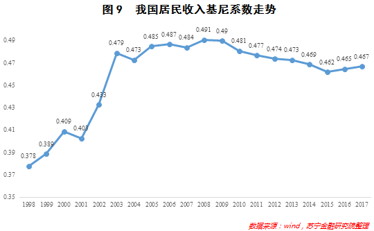 第三,基尼系数。我国居民收入的基尼系数自2000年首次超过警戒线0.4以来,总体上呈现出先攀升后稳定的态势。但值得注意的是,2003年至今,基尼系数从未低于0.46,而最近几年,更是逐年增大(参见图9)。