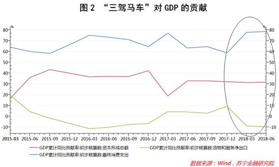根据wind数据,近年来的GDP构成中,最终消费支出的贡献程度始终居于“三驾马车”(指消费、投资、出口)之首。而进入2018年以来,最终消费支出对GDP的贡献不降反升(参见图2),第二季度的贡献程度甚至高达78.5%。诚然,这与另外两驾马车乏力有一定关系,但也不能否认消费仍旧是宏观经济增长的头号动力。