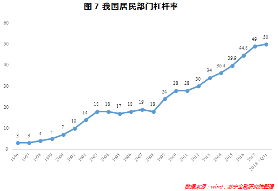 第一,居民杠杆率。从图7可知,1996年我国居民杠杆率只有3%,2008年也仅为18%,但是自2008年以来,居民杠杆率开始呈现迅速增长态势,短短六年间翻了一倍,达到36.4%,到了2017年已经高达49%,较之2008年激增了近30个百分点,也高于国际上大多数新兴市场国家的平均水平。而来自国家金融与发展实验室的最新数据显示,2018年初,我国居民杠杆率正式迈进50%的关卡。