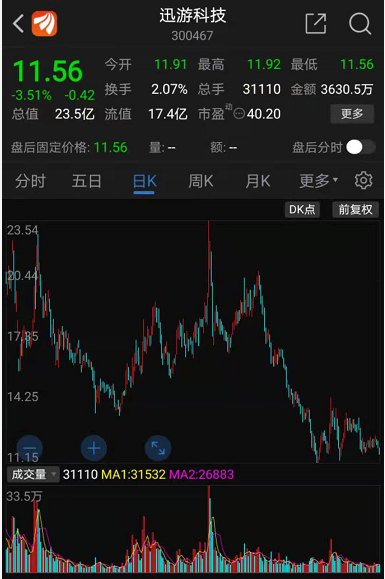 曾经在2015年的时候,迅游科技股价高达126.89元/股,也曾拥有过高光时刻。如今迅游科技股价一路下行,已跌至11.56元/股,股价跌跌不休的原因主要是因为公司业绩亏损严重,2018年、2019年,迅游科技分别亏损8亿元、12亿元,两年合计亏损达20亿元。
