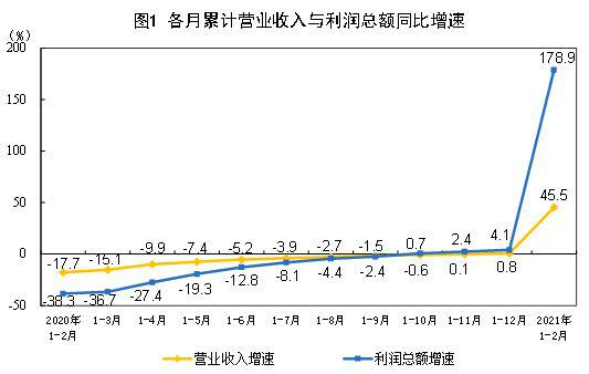 摘要:2021年1—2月份,规模以上工业企业实现利润总额11140.1亿元,同比增长1.79倍,比2019年1—2月份增长72.1%,两年平均增长31.2%。