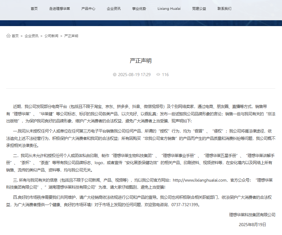 近期,我公司发现部分电商平台(包括且不限于淘宝、京东、拼多多、抖音、微信视频号)及个别网络卖家,通过电商、朋友圈、直播等方式,销售带有“理想华莱”、“华莱健”等公司标志、标识的我公司各类产品,以次充好、以假乱真;发布一些诋毁我公司品牌形象的言论;销售一些与我司有关的“非法出版物”,为保护我司良好的品牌形象,维护广大消费者的合法权益,避免广大消费者上当受骗,现声明如下: