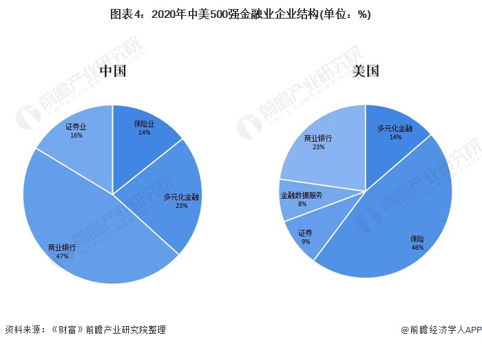 从“财富中国500强”与“《财富》美国500强”榜单中美金融业企业结构来看,美国金融业企业发展更全面,在5个细分领域均有上榜企业,其中保险企业数量最多,占比达到46%,商业银行和多元化金融企业数量占比分别为23%和14%。而中国上榜企业中,商业银行占据半壁江山,数量占比达到47%,在金融数据服务领域无上榜企业。