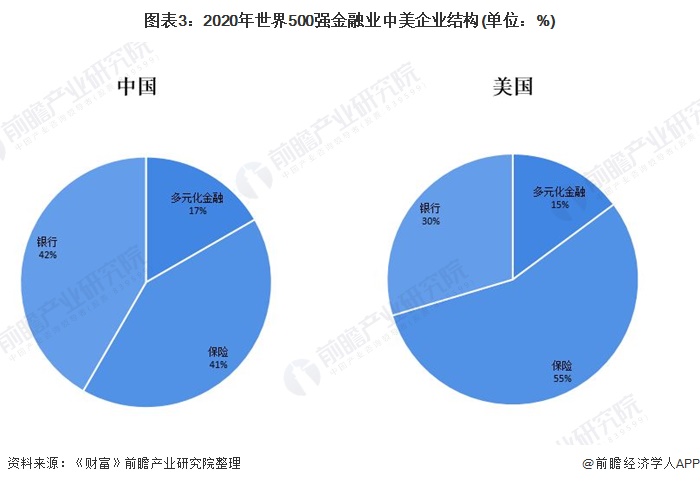 整体来看,在行业结构上,总体来看,美国保险业发展较为领先,而中国金融企业分布更加均匀。