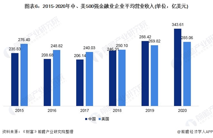 从“财富中国500强”与“《财富》美国500强”榜单中美金融业企业营收规模来看,2019年中国企业平均营业收入超越美国,2020年达到343.61亿美元。而美国企业平均营业收入虽然在2017年开始逐年增长,但中国企业增长势头强劲,逐渐拉开差距。