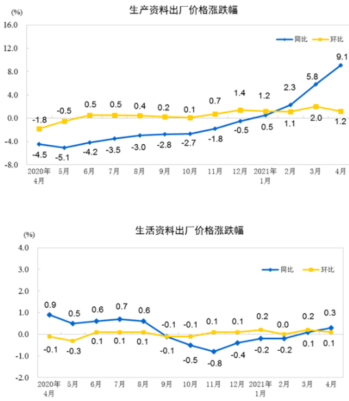 中国4月全国工业生产者出厂价格(PPI)同比上涨6.8%,涨幅为2017年以来最大,超过前值4.4%,环比上涨0.9%;工业生产者购进价格同比上涨9.0%,环比上涨1.3%。1—4月平均,工业生产者出厂价格比去年同期上涨3.3%,工业生产者购进价格上涨4.3%。
