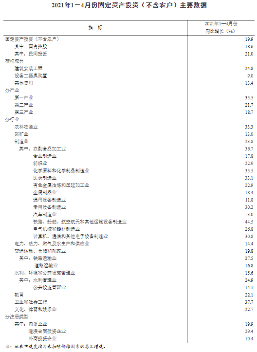 国家统计局今日发布的数据显示,1-4月份,全国固定资产投资(不含农户)143804亿元,同比增长19.9%;比2019年1-4月份增长8.0%,两年平均增长3.9%。其中,民间固定资产投资82519亿元,同比增长21.0%。从环比看,4月份固定资产投资(不含农户)增长1.49%。