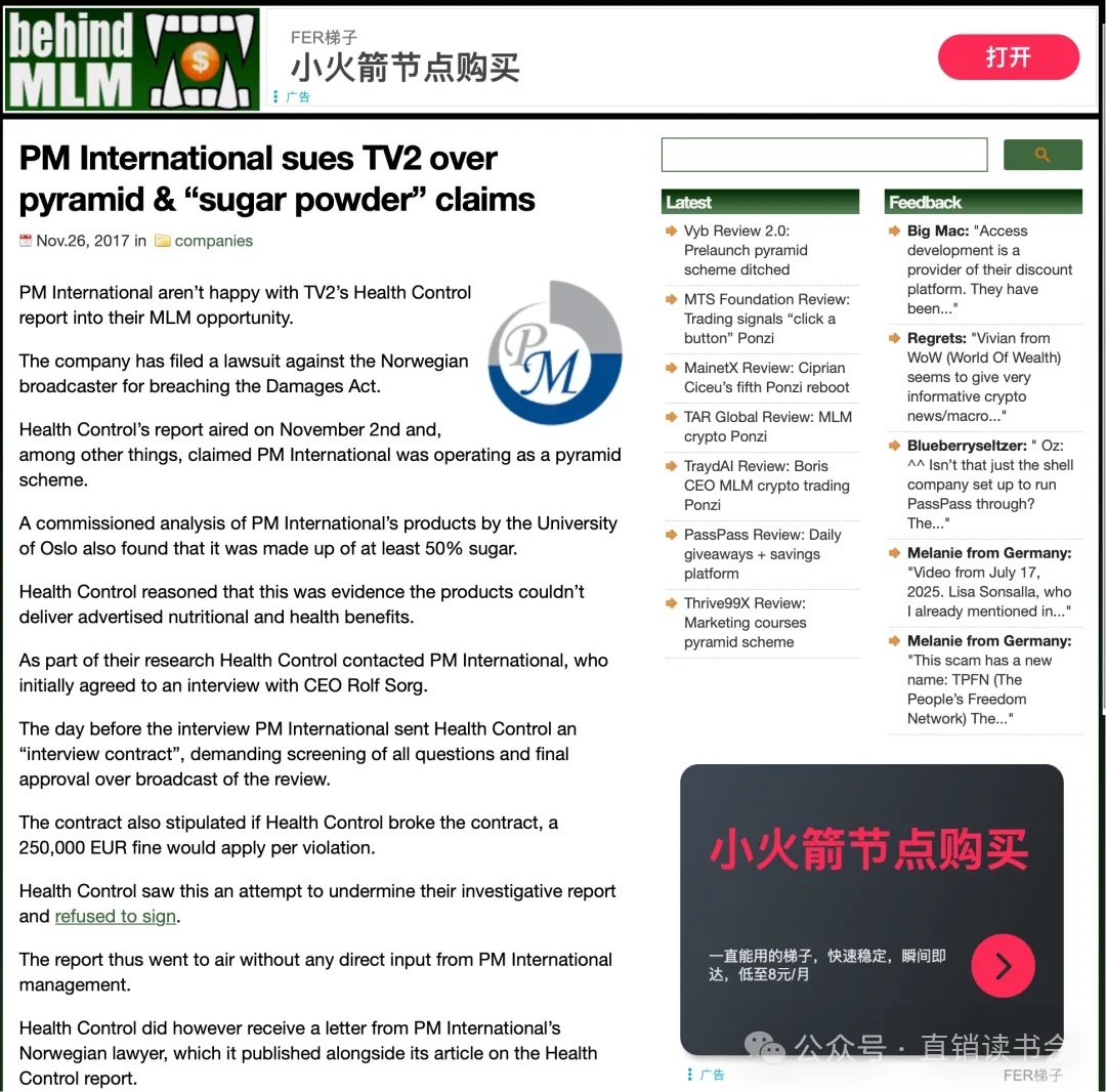 该案也反应出来PM International缺乏国际人才,硬刚媒体,无论在言论自由的国家,还是其他国家这个都是直销行业大禁忌。缺乏国际视野的法务、公关部以及品牌宣传部,虽然业绩上来,走的都是灰色地带,也就是跨国电商的方式,若不引进适合国际视野职业经理人团队,单纯的创始人一个人,走不远,也走不久!至少,在中国是行不通!