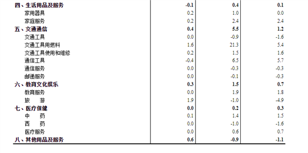 CPI环比下降0.2%。其中,城市下降0.1%,农村下降0.3%;食品价格下降1.7%,非食品价格上涨0.2%;消费品价格下降0.4%,服务价格上涨0.2%。