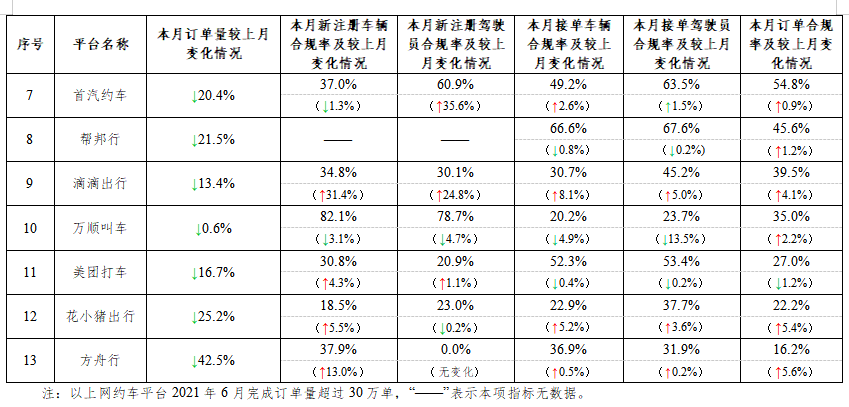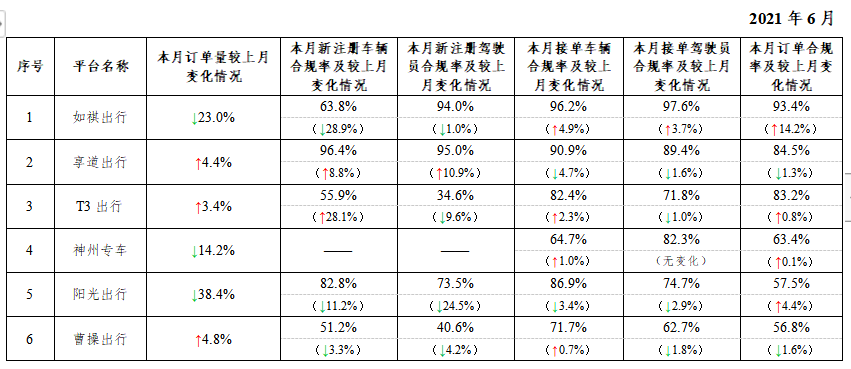 具体而言,6月订单合规率增长排名前3名,分别是如祺出行、方舟行、花小猪出行(按从高到低排序);下降最多的分别是曹操出行、享道出行、美团打车(按从高到低排序)。