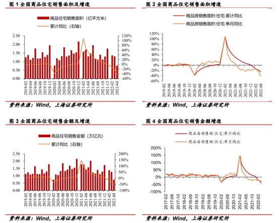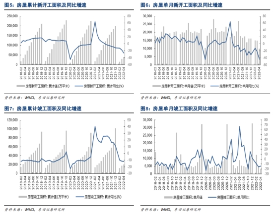 随着而来的便是新开工房屋面积的大幅下滑。从具体数据来看,2022年1-4月累计新开工面积39,739万平,同比-26.3%;其中,4月新开工面积9,901万平,同比-44.19%。2022年1-4月累计竣工20,030万平,同比-11.9%;其中,4月竣工面积3,101万平,同比-14.19%。2022年1-4月累计开发投资39,154亿元,同比-2.7%;其中,4月开发投资11,389亿元,同比-10.07%。