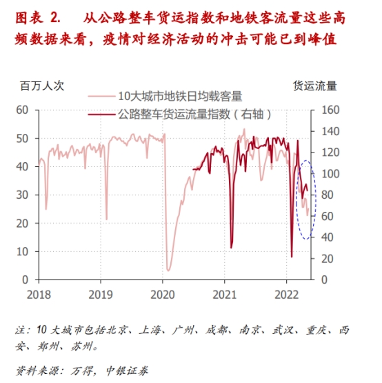 2022年4月我国宏观经济数据全面下滑。但从高频数据来看,疫情的冲击程度可能已到峰值。进入5月之后,公路整车货运指数已经从4月的低位回升,10大城市地铁客运量也有企稳之势。再考虑到近几周国内新增新冠确诊病例数明显走低的趋势,最坏的时候很可能正在过去。