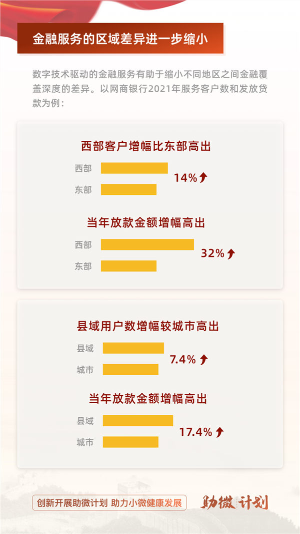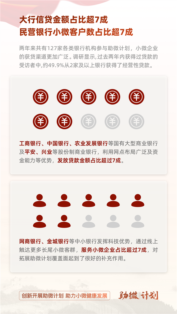 网商银行这样的互联网银行则借助科技优势,通过线上触达更多长尾小微客群,服务小微经营者占比超过7成,对拓展“助微计划”的覆盖面起到补充作用。
