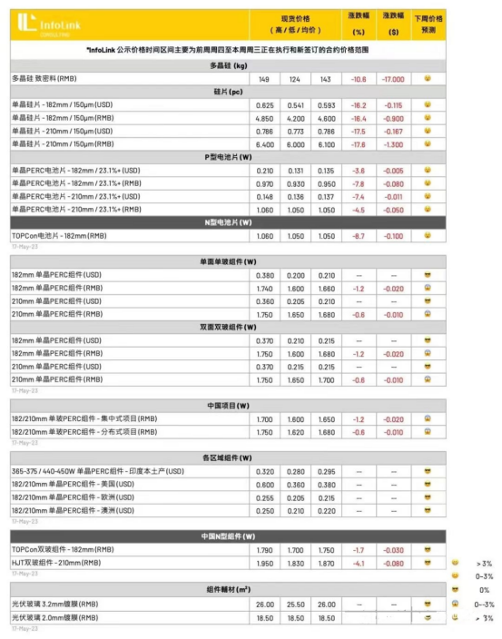 N-HJT组件(G12)价格受到供应链价格松动、以及PERC组件下滑影响,新的执行价格出现较明显下滑约每瓦1.83-1.87元人民币,与TOPCon价差约0.1元人民币。确实如上周预期随硅片电池片下降后出现松动,海外价格仍持稳约每瓦0.25-0.26元美金。