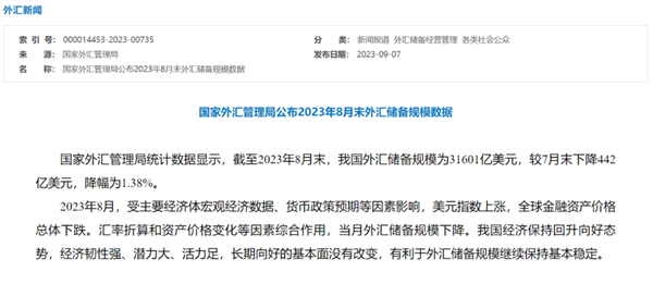 摘要:9月7日,国家外汇管理局公布2023年8月末外汇储备规模数据。数据显示,截至2023年8月末,我国外汇储备规模为31601亿美元,较7月末下降442亿美元,降幅为1.38%。