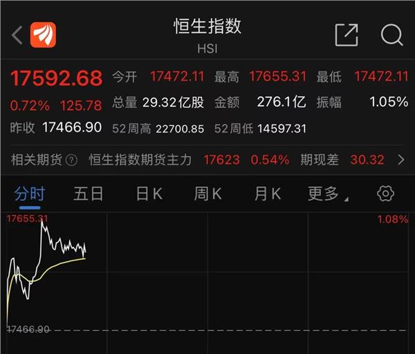 港股高开,恒生指数盘中一度涨超1%,截至发稿仍涨0.72%。