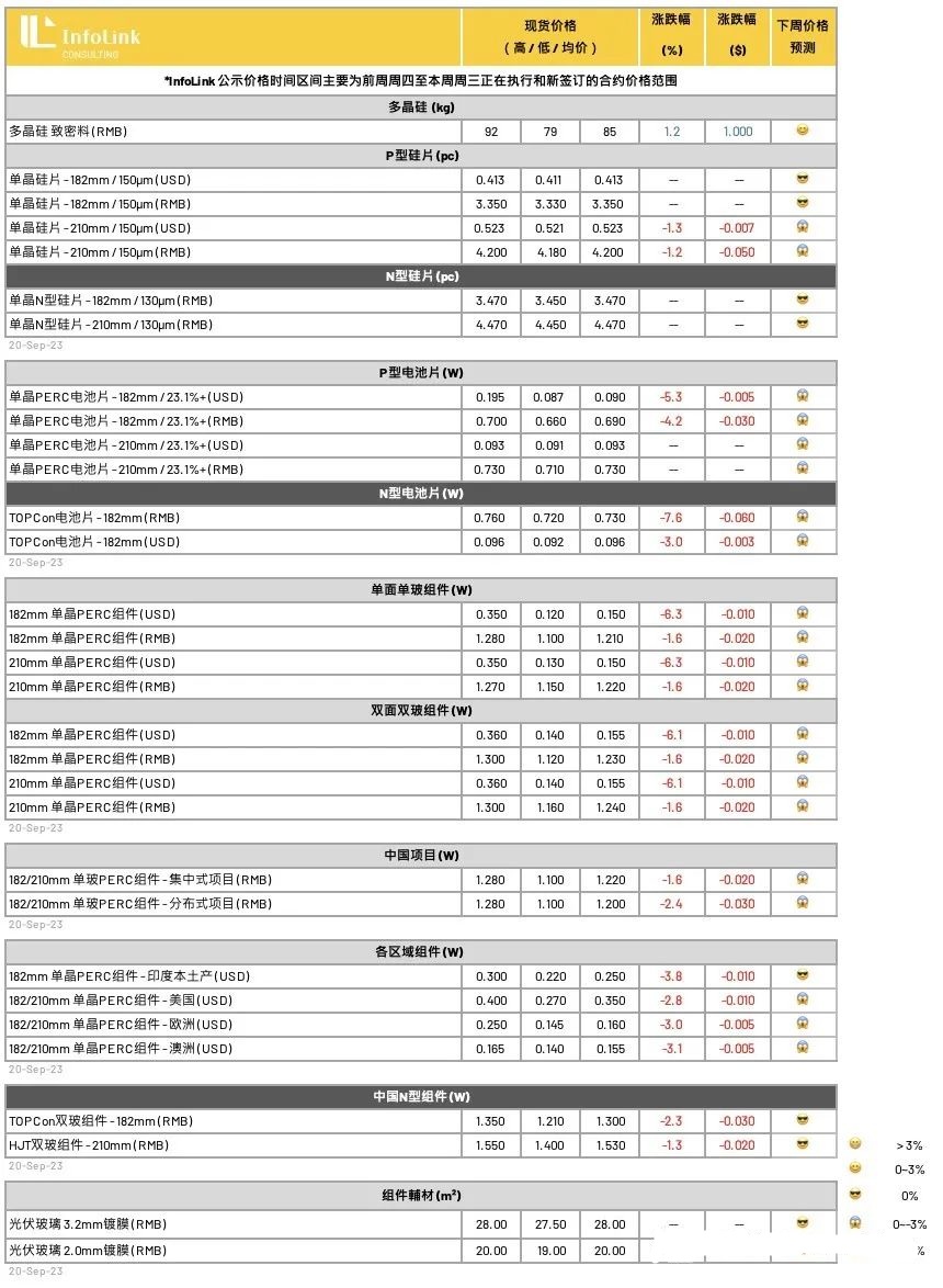本周组件价格受供应过剩、需求暂时并无爆发式增量、迭加电池片价格滑落等影响,前期酝酿涨价动能减弱,组件执行价格松动,单玻均价略为下滑至1.2-1.22元人民币。一线厂家为争取订单,也有部分让价,新单价格多集中1.18-1.2元人民币。中后段厂家考虑成本、价格僵持,单玻平均价格约在每瓦1.2-1.21元人民币,低价1.15-1.16皆有耳闻。接下来需要观察9月下旬排产下修、以及10月中国假期影响,9-10月排产将出现下调。