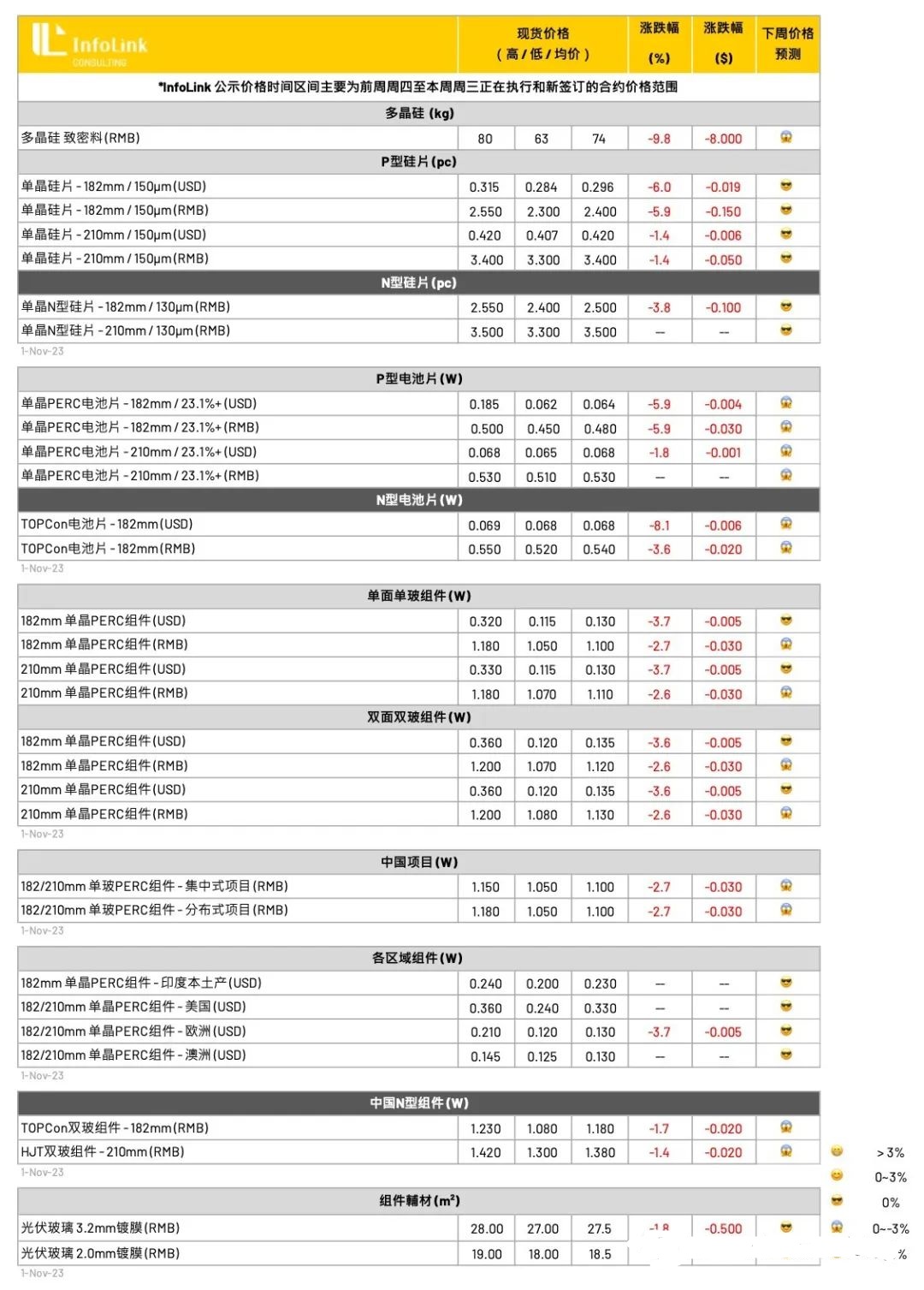 11月组件价格仍在下探,本周均价已往每瓦1.1元人民币靠拢,主要前期订单执行。新签订单已开始靠向每瓦1.03-1.07元人民币正在增多,预期12月主流价格将来到1-1.05的区间。低价部分确实有跌破一元人民币的交单,但其交付仍是少量、且部分为海外拉回库存等等并不计入主流交付常规规格报价之中。