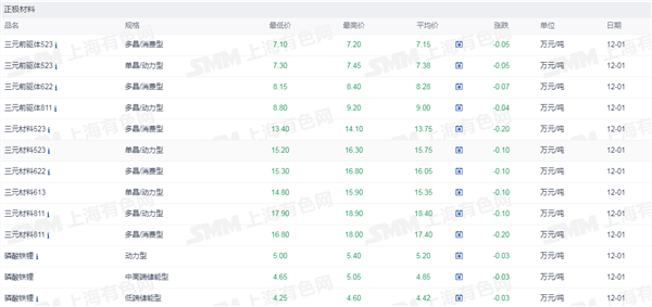 证券之星新能源车行业周报:据上海有色网,截止12月1日,电池级碳酸锂12.50-13.50万元/吨,均价13.00万元/吨,环比上一工作日下滑0.10万元/吨;工业级碳酸锂11.30-12.40万元/吨,均价11.85万元/吨,环比上一工作日下滑0.20万元/吨。供应端,近期部分上游大厂开始逐步放出前期储备库存,锂盐市场流通有所增量,但当前下游采买需求依旧疲软,供强需弱之下,市场看跌情绪依旧浓重,价格承压下行。