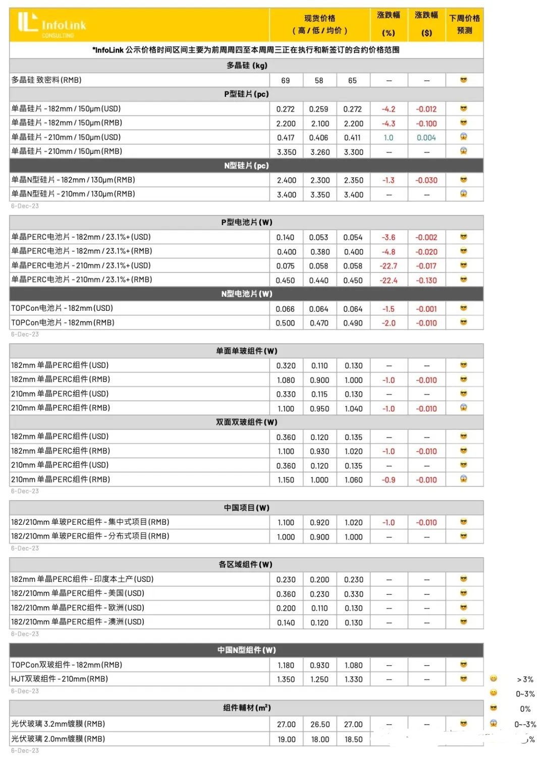 本周电池片成交价格仍在下跌,P型部分,M10电池片成交价格下坠到上周低价成交区段,每瓦0.4元人民币左右成为大量成交的价格;而G12尺寸成交价格也出现「急剧性」的跌价,价格随着国内项目开始收尾、电池片大型订单集中采购完成后,在12月初短期的供需错配回复正常,引导G12尺寸电池片价格也补跌到合理范围,主流成交价格下行至每瓦0.45元人民币左右,跌价幅度高达22%,价差也回归每瓦0.05元人民币区段。