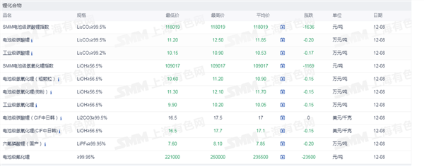 摘要:证券之星新能源车行业周报:据上海有色网,截止12月8日,电池级碳酸锂11.2-12.5万元/吨,均价11.85万元/吨,环比上一工作日下滑0.2万元/吨;工业级碳酸锂10.15-10.9万元/吨,均价10.53万元/吨,环比上一工作日下滑0.17万元/吨。
