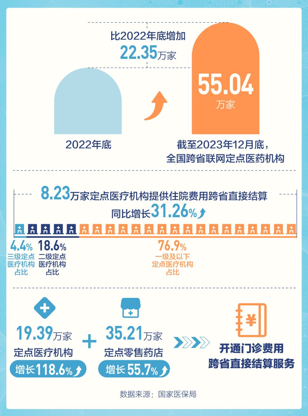 另一方面,异地就医结算推进优质医疗服务资源全国共享,助力推进医疗服务市场高水平统一。截至2023年12月底,全国跨省联网定点医药机构55.04万家,比2022年底增加22.35万家。8.23万家定点医疗机构提供住院费用跨省直接结算,同比增长31.26%。其中,三级、二级、一级及以下定点医疗机构占比分别为4.4%、18.6%、76.9%。19.39万家定点医疗机构和35.21万家定点零售药店开通门诊费用跨省直接结算服务,分别同比增长118.6%、55.7%。北京和上海本地定点医疗机构基本做到应开尽开,让更多参保患者享受到优质医疗服务。