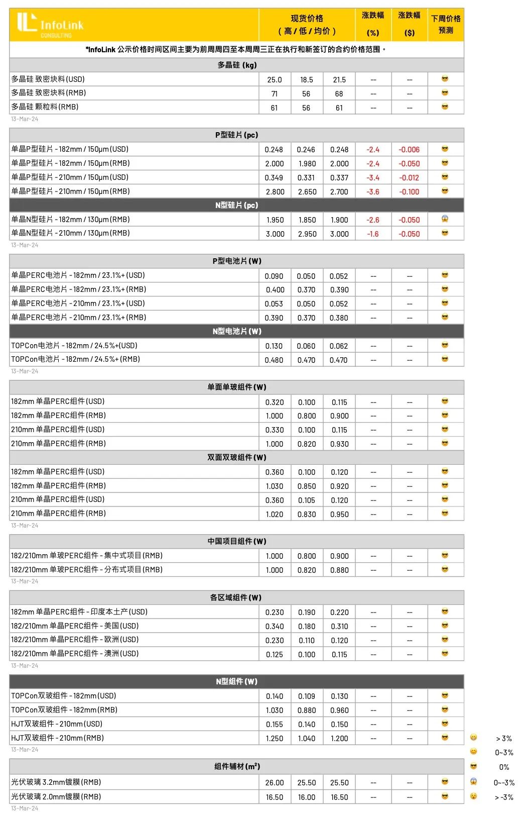 本周组件成交价格维稳,PERC 双玻组件每瓦 0.85-0.9 元人民币;TOPCon 组件执行价格每瓦 0.88-0.96 元人民币;HJT 组件价格稳定每瓦 1.04-1.25 元人民币的价格水平。