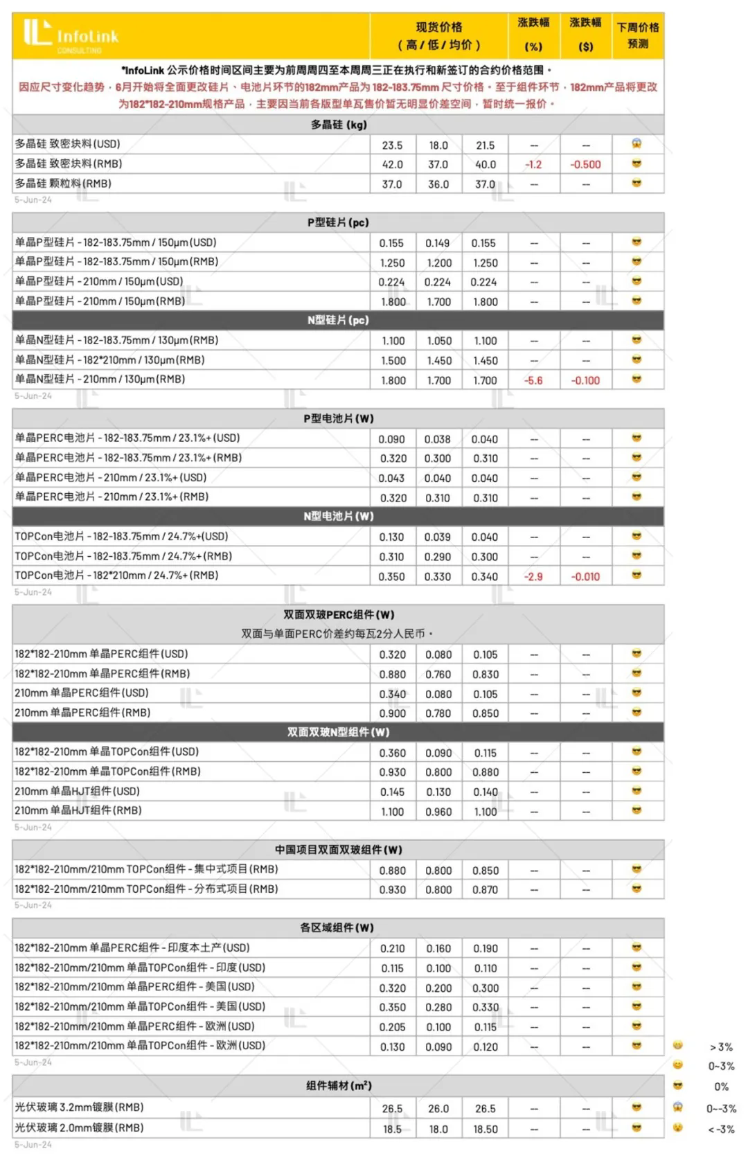 而其余规格,182 PERC 双玻组件价格区间约每瓦 0.78-0.88 元人民币,国内项目减少较多,价格开始逐渐靠向 0.8-0.83 元人民币,低效产品价格快速下探,每瓦 0.71-0.75 元人民币的价格也可看见,但因项目并非正常效率与订单模式将会剔除现货表采集样本,因此本周低价并无列示该价格。HJT 组件近期并无太多项目交付,价格维稳约在每瓦 0.97-1.18 元人民币之间,均价已靠拢 1.1 元人民币的区间、并朝向 1 元的价位前进,低价也可见低于 1 元的价格。