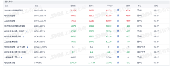 证券之星新能源车行业周报:据上海有色网,截止6月27日,电池级碳酸锂6.04-6.19万元/吨,均价6.115万元/吨,环比上一工作日上涨550元/吨;工业级碳酸锂5.905-6.005万元/吨,均价5.955万元/吨,环比上一工作日上涨550元/吨,碳酸锂现货成交价格重心呈现震荡上行。当前碳酸锂市场仍延续供大于求的基本格局,供需矛盾依然突出。从供应端看,市场可流通货源充足,库存压力尚未得到有效缓解。近期碳酸锂价格的阶段性回升主要受宏观及市场情绪等外部因素驱动,而非基本面改善所致。需求侧方面,下游正极材料企业仍保持审慎的采购策略,以刚性需求采购为主,尚未出现明显的补库意愿,市场整体观望情绪浓厚。在此市场环境下,下游材料企业更倾向于通过长协加量的方式锁定采购成本,以确保原料供应的稳定性。