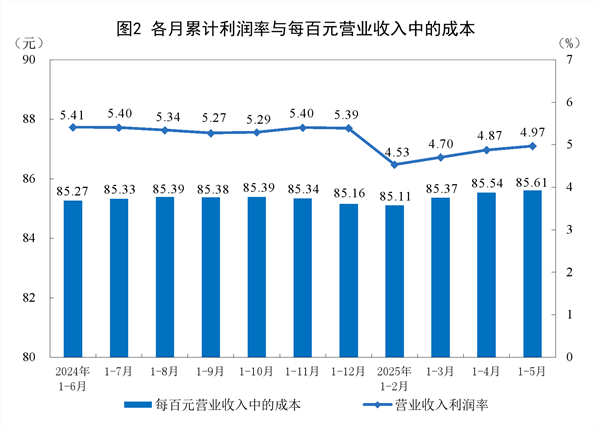 1—5月份,规模以上工业企业实现营业收入54.76万亿元,同比增长2.7%;发生营业成本46.88万亿元,增长3.0%;营业收入利润率为4.97%,同比下降0.19个百分点。
