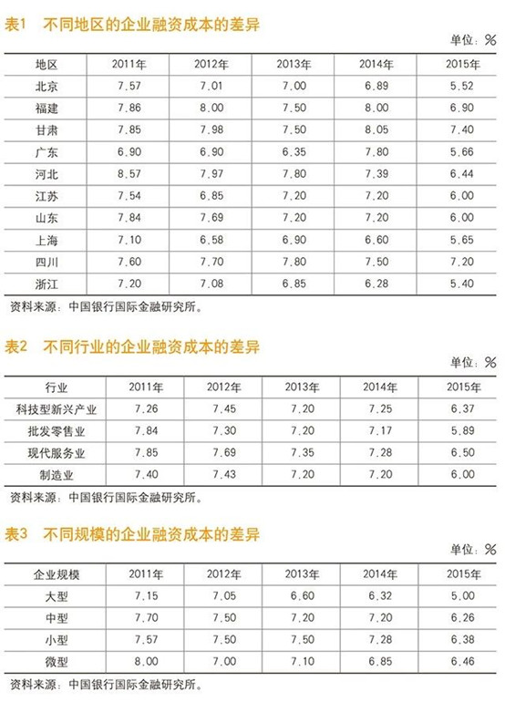 我国企业融资差异化程度较高,表现在不同地域、不同行业、不同规模之间存在融资可得性和成本的差异(如表1、表2、表3所示)。一般而言,从正规银行渠道融资看,大型企业融资成本低于中小企业融资成本,资金利差在1.5个百分点左右。从行业看,科技新兴产业、现代服务业和批发零售业的资金利率要高于传统制造业,利差在1个百分点左右。从区域看,东部沿海地区的资金可获得性要好于中西部,成本要低于中西部,成本差可达到2个百分点左右。不同区域的价差与金融供给有一定关系,但融资成本差异更多的是由信用差别造成,体现了不同信用定价。