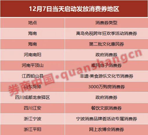 “全力拼经济、抓发展,稳经济、惠民生”,各地密集启动新一轮消费券发放。据证券时报·券商中国记者不完全统计,12月以来的一个多星期,全国就有41地宣布启动消费券发放相关活动,其中,仅12月7日当天启动的活动就有10项。在消费券覆盖的行业中,汽车、家电、餐饮仍为主流,同时,文旅行业也是各地促消费的重要抓手。