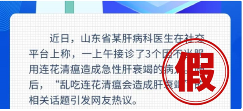 这则传言起因是网络出现“山东某医生在社交平台称:一上午接诊3个因服用连花清瘟造成急性肝损伤的病人”,所以出现“乱吃连花清瘟出现肝衰竭”的谣言。